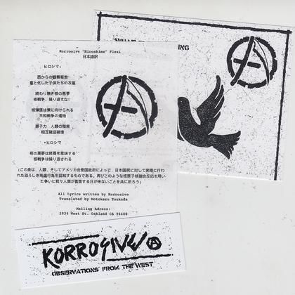 2019年11月来日のオークランドシティパンクス、KORROSIVE。そのツアー会場でも販売されている2曲入りFlexiが入荷。 MANIC RELAPSE FESTを21,2歳から運営するボーカルChrisが、"MANIC CITY FLEXI SERIES"として、今後色々なバンドのFlexiを出していく予定、今回がその第一弾となるリリースです。 アルバム(と日本編集盤CD)にも収録の"HIROSHIMA"と"HIROSHIMA CONTINUED"(ピアノによるインストトラック)を片面Flexi化。 500枚ハンドナンバリング入りで、ジャケに1枚1枚スタンプ押しがされていたり、バンドステッカー、アートワークインサート、そして日本語対訳つきの歌詞インサートがついた凝った仕様です。 ミッドテンポのロウハードコアパンクが地球を覆う核がジワジワ迫る恐怖と怒り、そして憂鬱を雄弁に語る全2曲収録。 Observations From The West by Korrosive