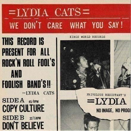 *通販は商品代金合計1000yen以上より承っております。 若干再入荷しました。 GESSを発端とし、福岡博多を拠点に活動していたLYDIA CATS! 87年KINGS WORLDから低価格にてリリースされた3曲入りソノシートがデッドストックで入荷しました。消費税は加算されますが本体価格は当時の据え置きです。 Side Aにはシニカルな歌詞と小気味よくキャッチーに疾走するパンクロック、"COPY CULTURE"を45RPMで、Side Bには33RPMでこちらも軽快なKYUSYU PUNK2曲を収録の、全3曲入り! ニュースペーパー型折りたたみジャケ仕様。